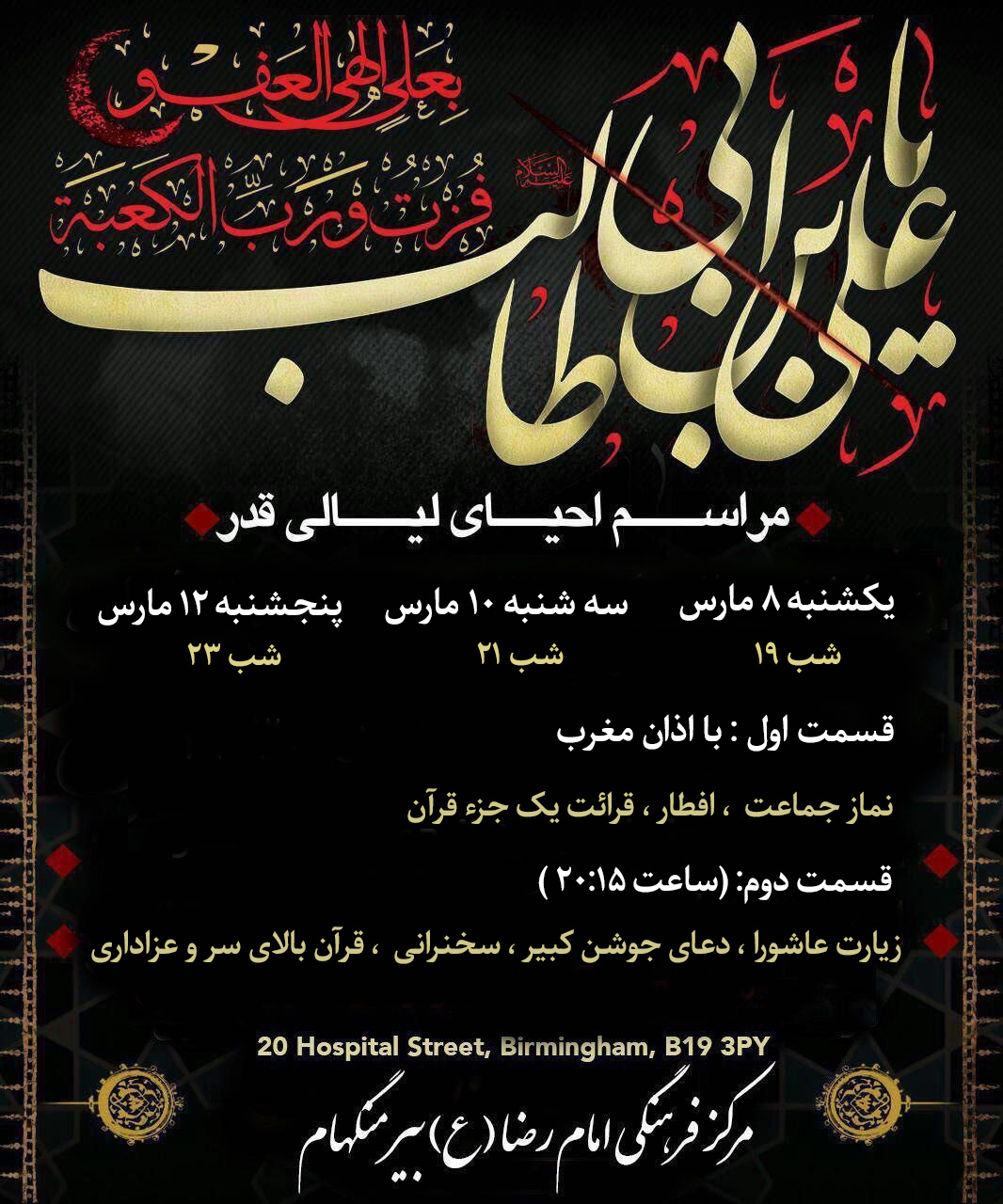 اطلاعیه مراسم عزاداری دهه محرم مرکز فرهنگی امام رضا (ع) بیرمنگهام